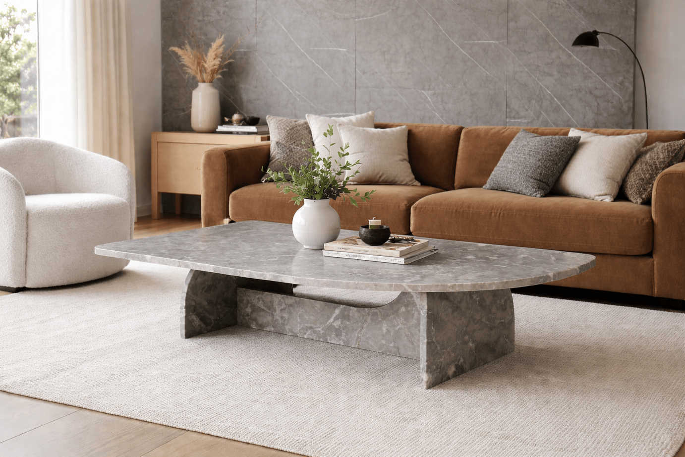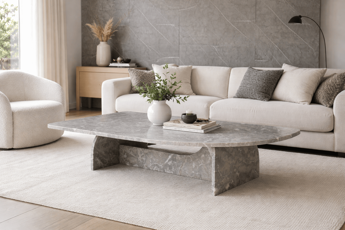 Elevate your living space with this sculptural grey marble coffee table, crafted from premium natural stone. Featuring a smooth oval top and a bold curved base, the design highlights the unique veining and organic beauty of real marble—making each piece truly one of a kind.