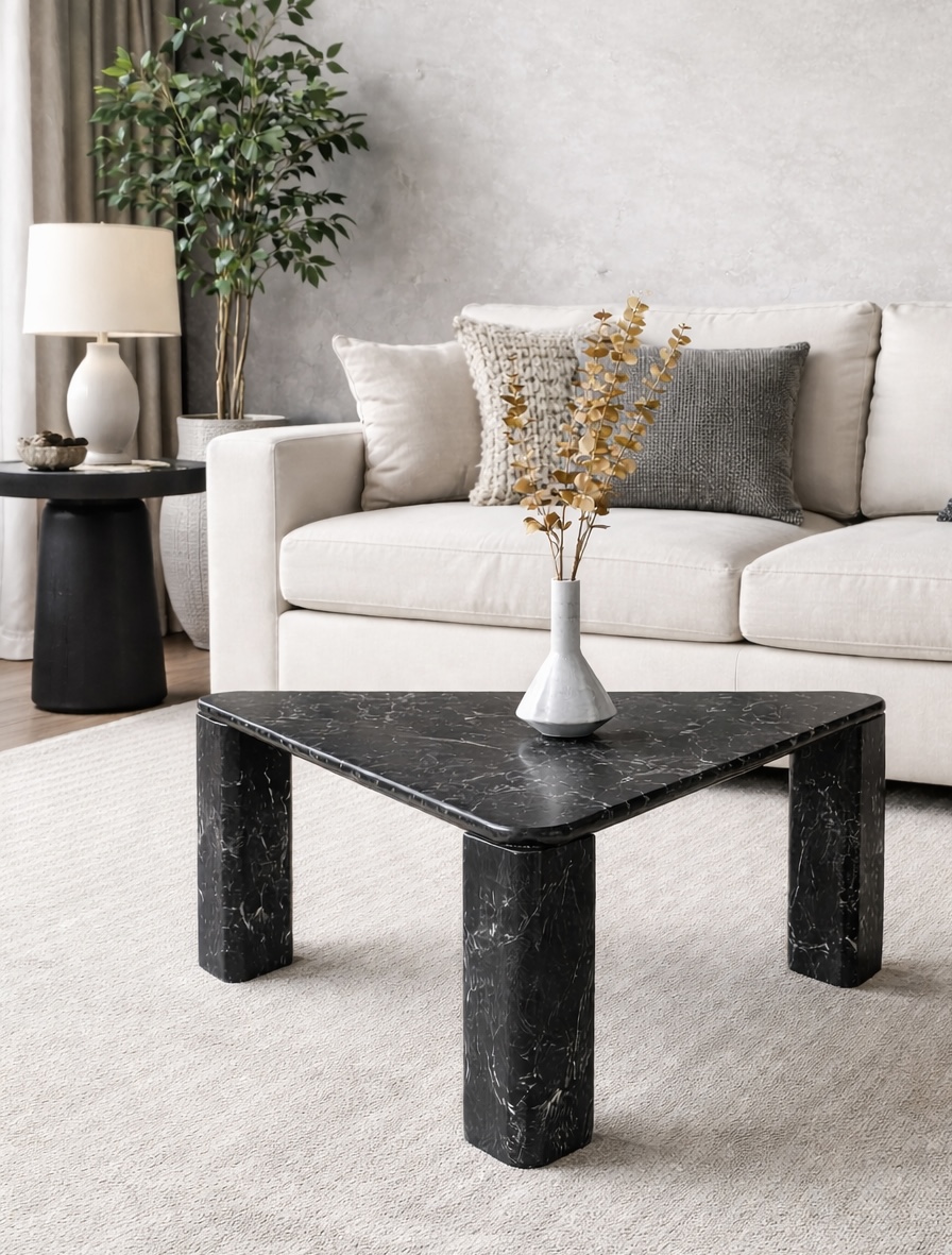 A bold and modern statement piece crafted from premium black marble with natural white veining. Featuring a sleek triangular top and solid cylindrical legs, this sculptural design adds elegance and character to any contemporary living space.